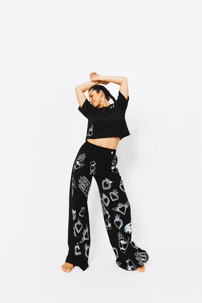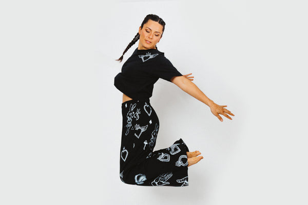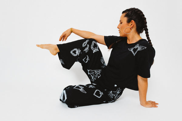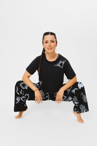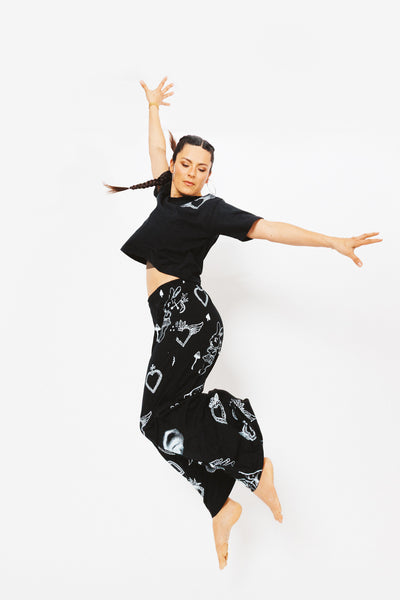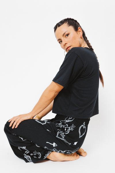 La polera crop está fabricada de jersey nacional en color negro y estampado con serigrafía a mano. Tiene corte holgado, muy relajado y de largo crop a la cintura.