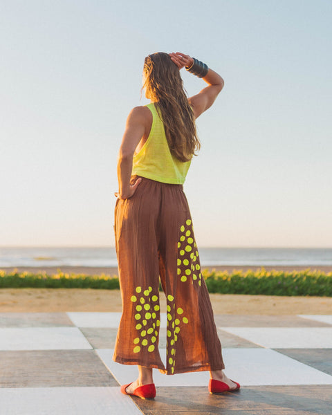 PANTALON/FALDA KRISTINA está fabricado de muselina 100% algodón color chocolate, es una tela extremamente liviana, fresca pero estructurada.