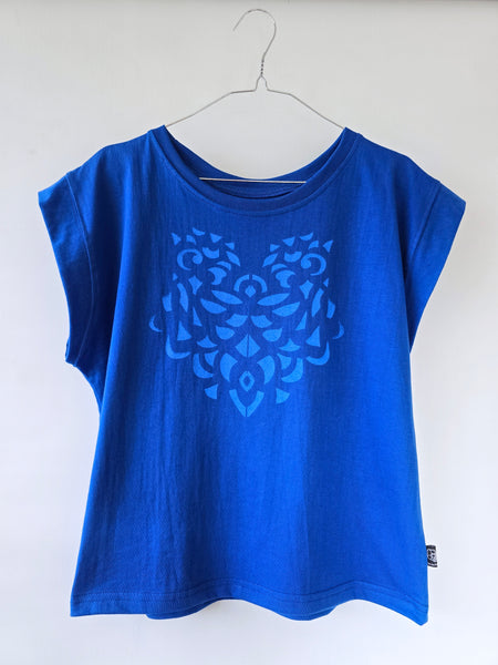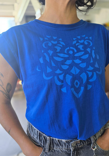 La Polera AZUL está fabricada de jersey de algodon nacional color azul rey estampado con azul ducado. La polera tiene corte recto con calce suelto y relajado con manga formada que estiliza.
