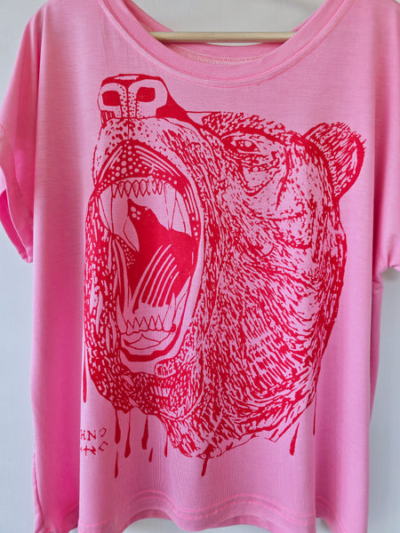 Color ROSA con estampado en rojo. Disponible en tallas s/m y m/l y xl.