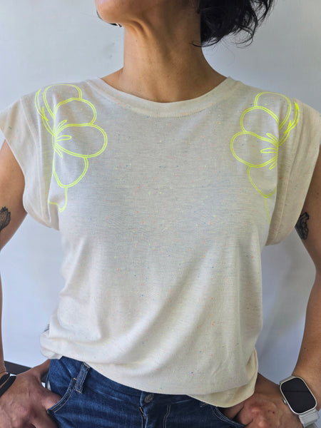 La Polera PEINE está fabricada de jersey de algodon nacional color crudo con chispitas de colores y estampado con detalle con amarillo. La polera tiene corte recto con calce suelto y relajado con manga formada que estilizan.