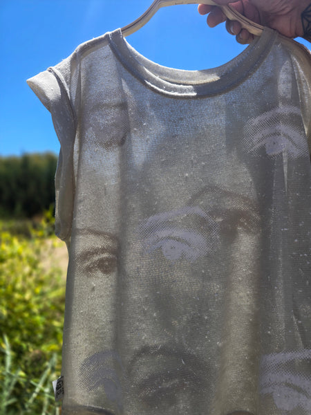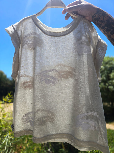TOP OJOS está fabricada de tejido industrial typo jersey texturado, tela ligera con transparencia. Tiene corte recto con calce suelto y relajado con manga formada que estilizan.